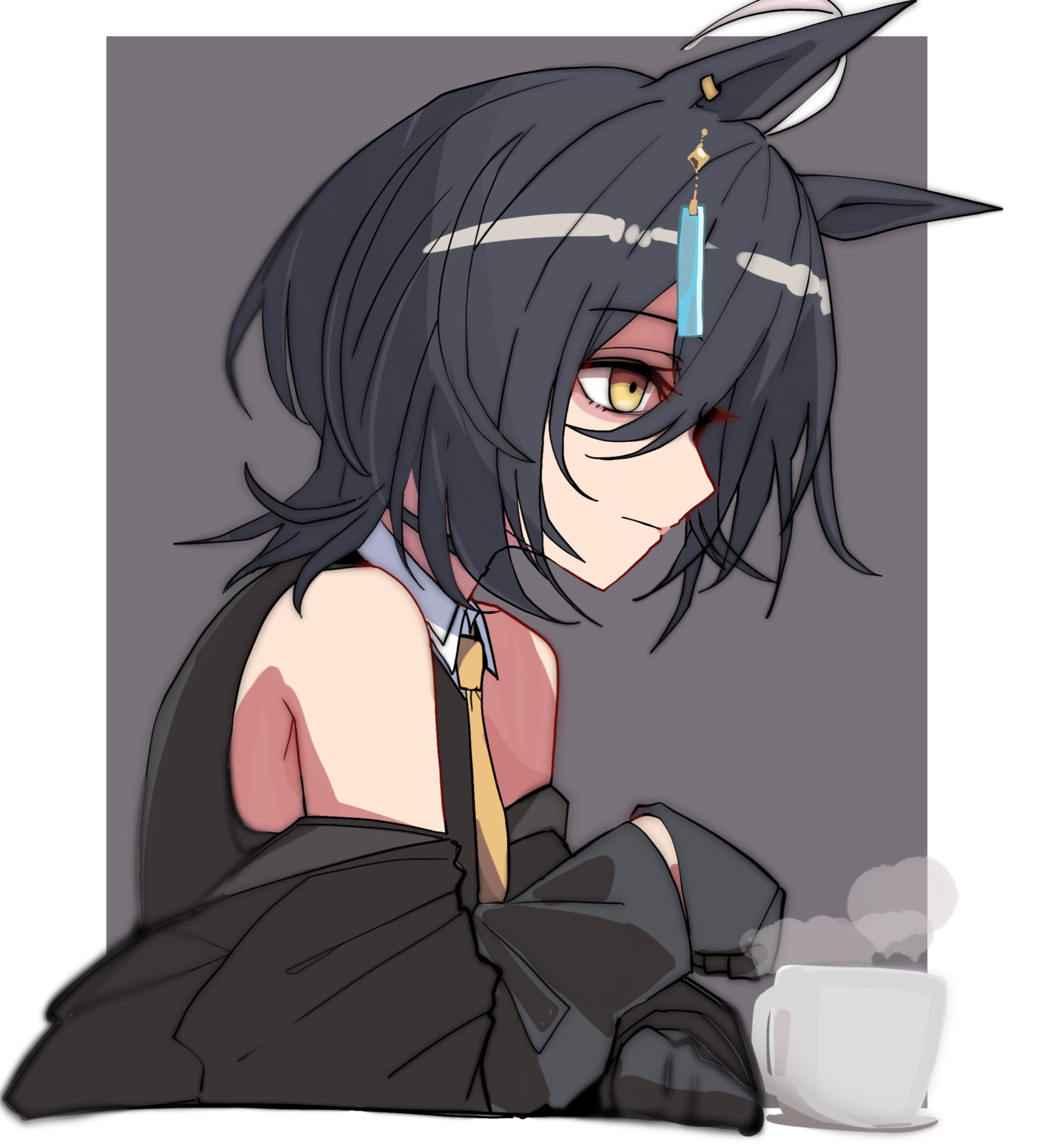 1girlahogealternate hair lengthalternate hairstyleanimal earsbare shouldersblack glovesblack hairblack jacketblack shirtbrown eyesbrown necktieclosed mouthcollared shirtcupfrom sidegloveshair between eyeshorse earsjacketlong sleevesmugmulticolored hairnecktieoff shoulderopen clothesopen jacketshirtsleevelesssleeveless shirtsolosteamtwo-tone hairupper bodywhite hair