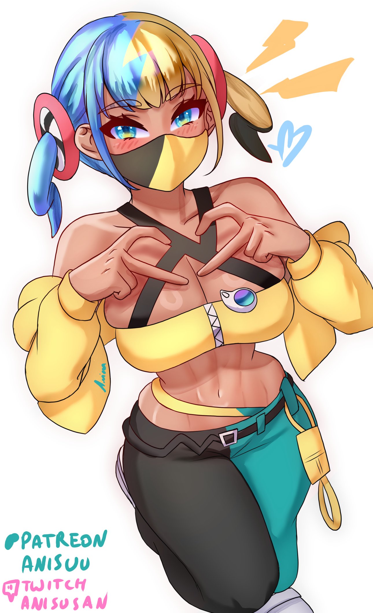 1girlalternate breast size (larger)armpit creasebandeaubare shouldersbeltblonde hairblue eyesblue hairblushbreastscleavagecrop topcropped jacketenglish textheartlarge breastsmaskmega stonemidriffmouth maskmulticolored hairnavelpantsshoessimple backgroundstomachstraplesstube toptwintailstwo-tone hairwhite backgroundzipper