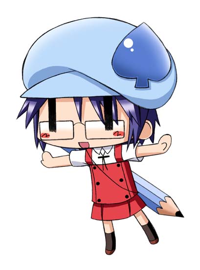 1boy1girlaoki ume (style)blue hairchibicosplaycrossoverfemale focusglasseshatmiki (shugo chara!) (cosplay)parodypencilschool uniformshort hairsolostyle parodywide facewooden pencilyamabuki high school uniform