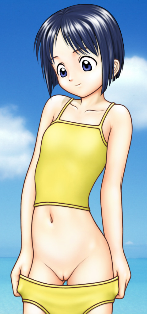 1girlbare shouldersbikiniblue eyesblue hairbob cutcamisolecleft of venusfemale focusmatching hair/eyesmidriffoceanpussyshort hairsoloswimsuittankiniuncensoredundressing