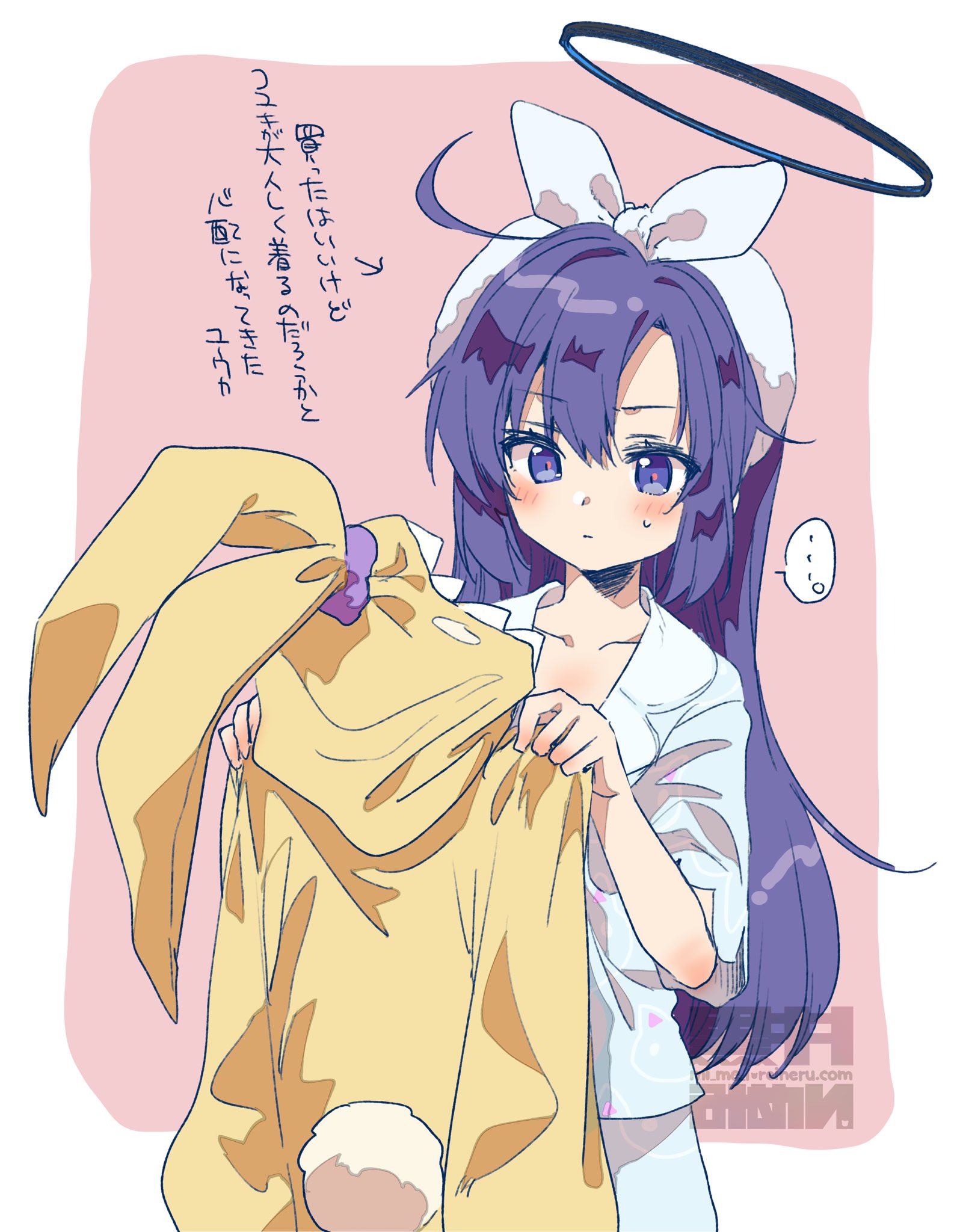 1boy1girlanimal earsarrow (symbol)black haloblue pajamasblushborderbowclosed mouthcowboy shotcowlickfake animal earsfake tailfrownhair between eyeshair bowhair downhair intakeshalohands upholdingholding unworn clotheslong hairlooking at objectofficial alternate costumeofficial alternate hairstyleoutside borderpajamaspink backgroundpink pupilspurple eyespurple hairrabbit earsrabbit tailshort sleevessimple backgroundsolospeech bubblespoken ellipsissweatdroptailv-shaped eyebrowsvery long hairwatermarkwhite borderwhite bowyellow pajamas