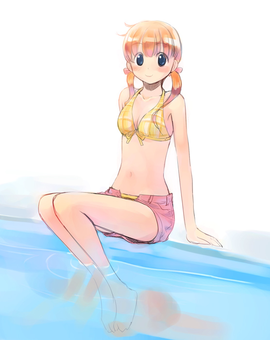 ryouzou, kokono asou, better girls, 1girl, barefoot, bikini, feet, green eyes, green hair, long hair, ponytail, sitting, smile, swimsuit