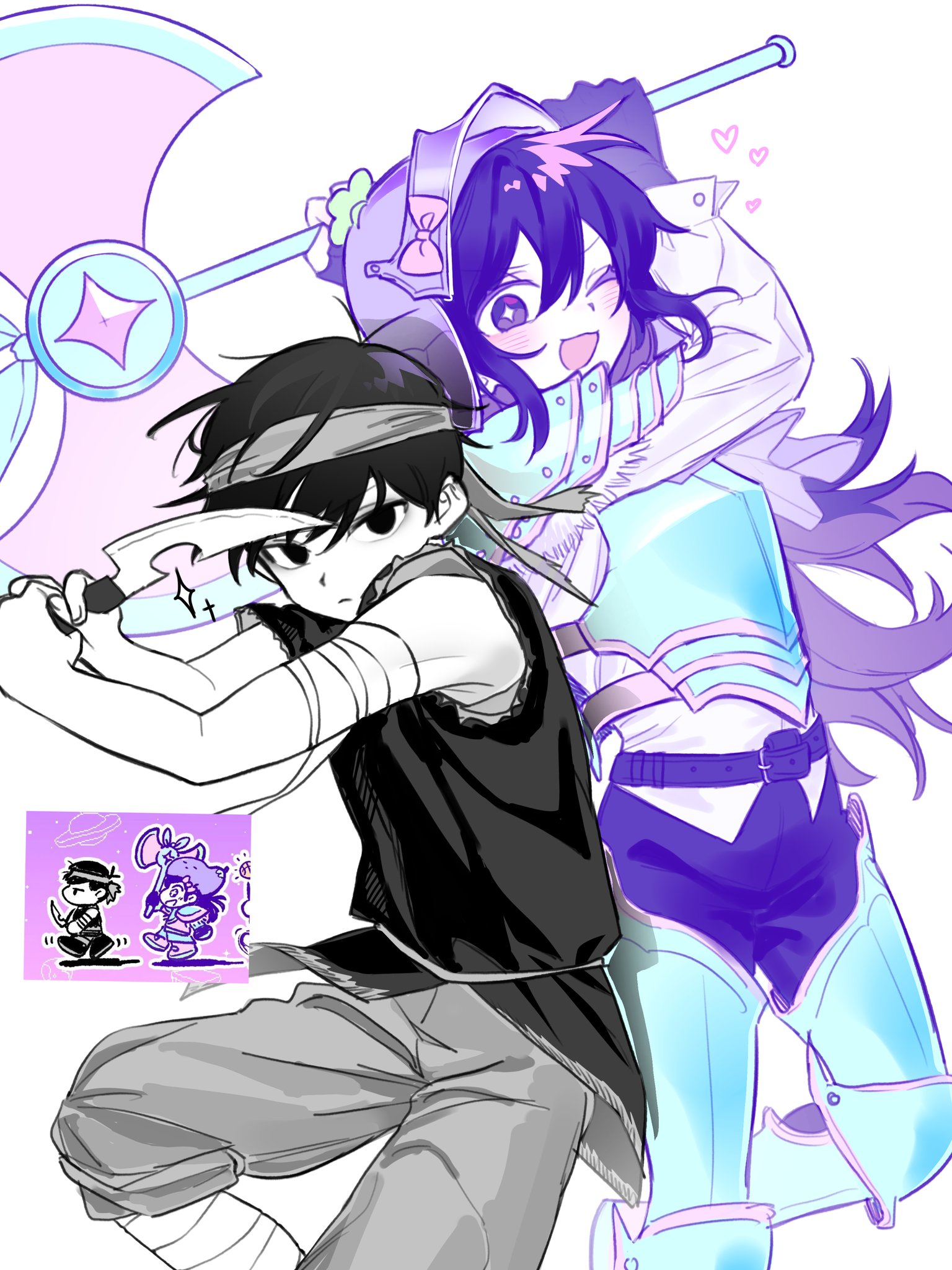 1boy1girlalternate costumeantenna hairarmorarms upaxebandaged armbandaged legbandagesbattle axeblack eyesblack hairblushbowdouble-parted bangsgrey pantshair between eyesholdingholding axeholding knifeknifelong hairlong sleeveslooking at viewerone eye closedopen mouthpantspink bowpurple eyespurple hairshort hairsimple backgroundsmileweaponwhite background