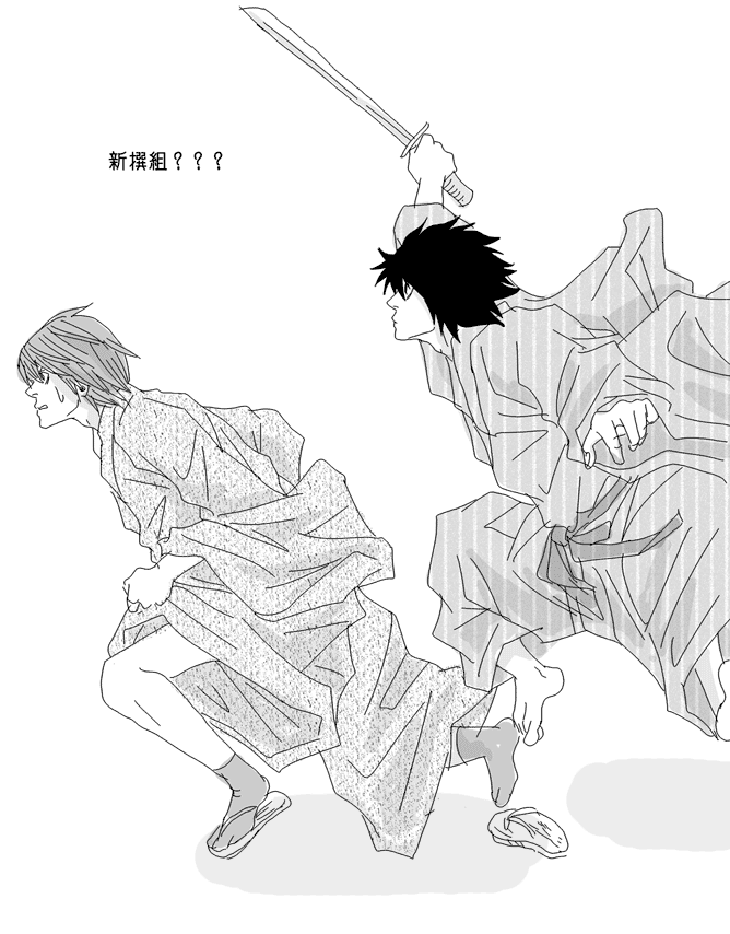 00s2boyschasinggreyscalejapanese clotheskatanamale focusmonochromemultiple boysrunningsandalsswordtabiweapon
