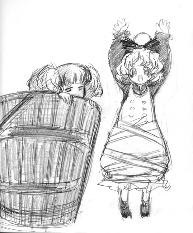2girlsbucketdressfemale focusgreyscalehair ribbonin bucketin containermonochromemultiple girlsribbonsketchwhite background