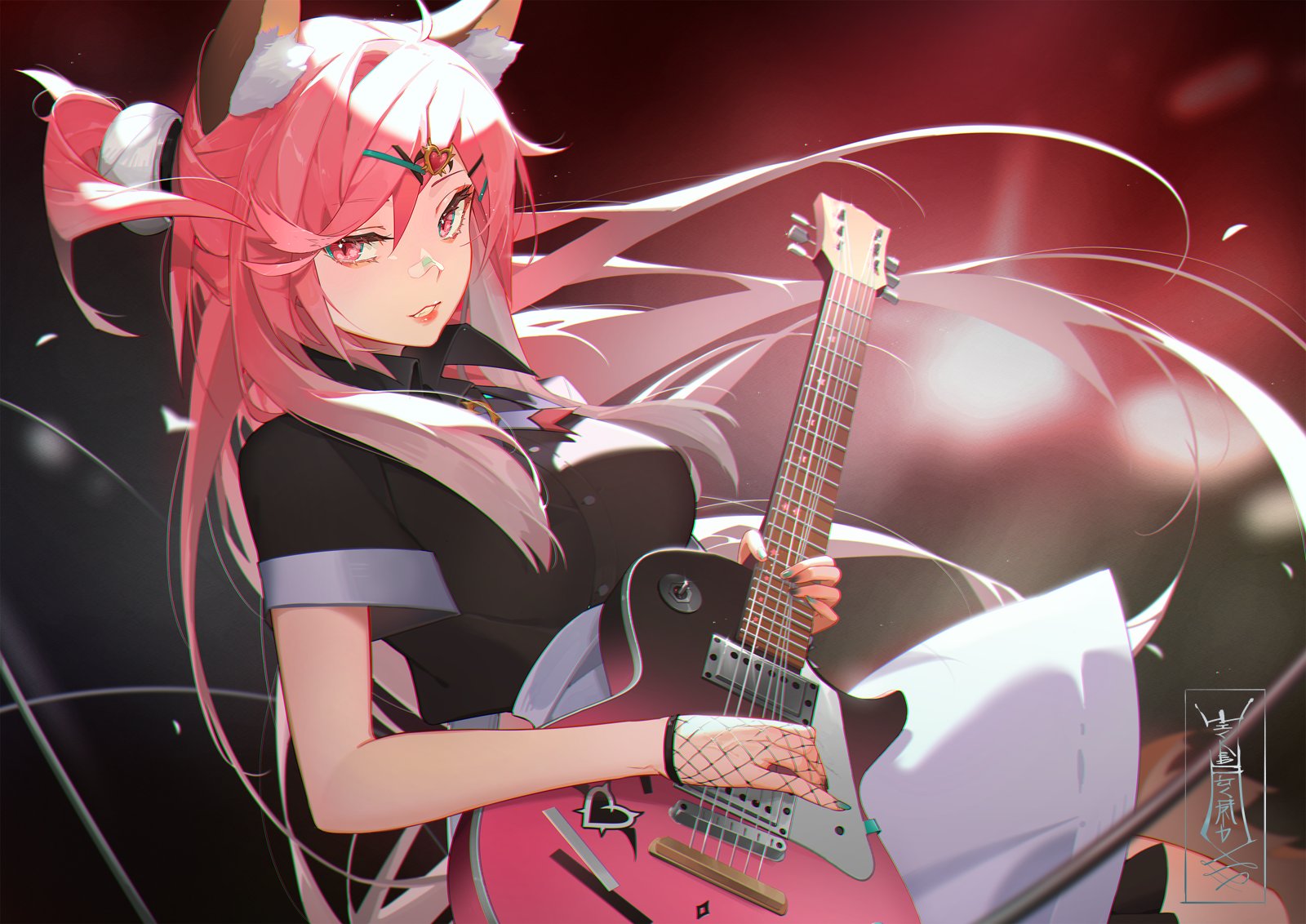 1girlanimal ear fluffanimal earsblack shirtbreastscoffy (comic fiesta)comic fiestadouble-parted bangsfishnet glovesfishnetsglovesguitarhair between eyeshair ornamentinstrumentlong hairlooking at viewermedium breastsmusicparted lipspink eyespink hairplaying guitarplaying instrumentshirtshort sleevessoloupper body