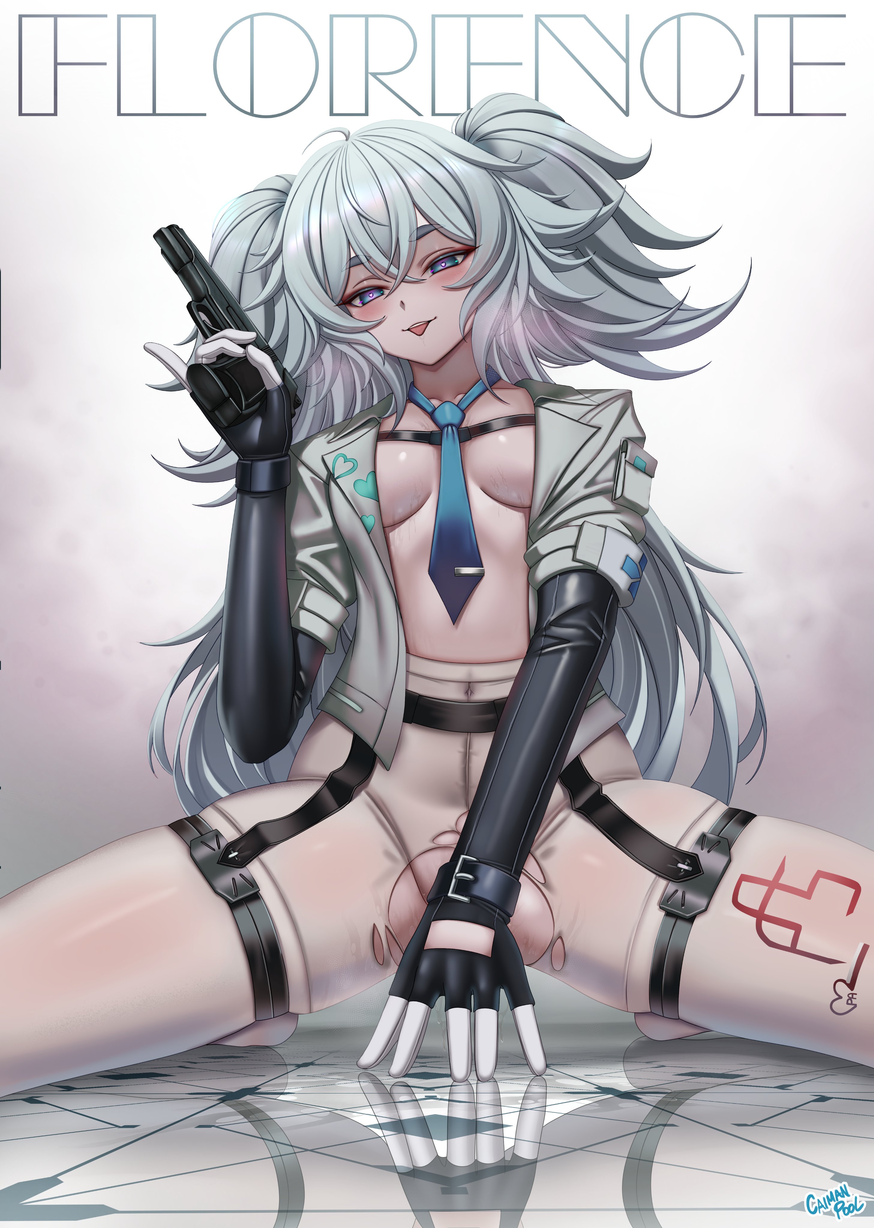 1girlartist nameblue eyesblue necktiebreastsbreasts apartcharacter namegunholdingholding gunholding weaponjacketlong hairlooking at viewermab pa-15necktieopen clothesopen jacketpantyhosereflective floorsolotorn clothestorn pantyhoseweaponwhite jacket