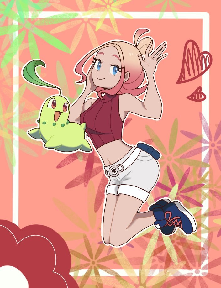 1girlbeltblue eyesclosed mouthgen 2 pokemonhair bunhand on own facelooking at anotherlooking at viewermidriffnavelopen mouthpink hairpokemon (creature)short shortsshortssingle hair bunsleevelesssmilestomachwhite beltwhite shorts