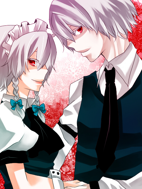 1boy1girlbraidbreastsdual personagenderswapgenderswap (ftm)gradient backgroundmaidnecktiered eyesshort hairtwin braidswhite background