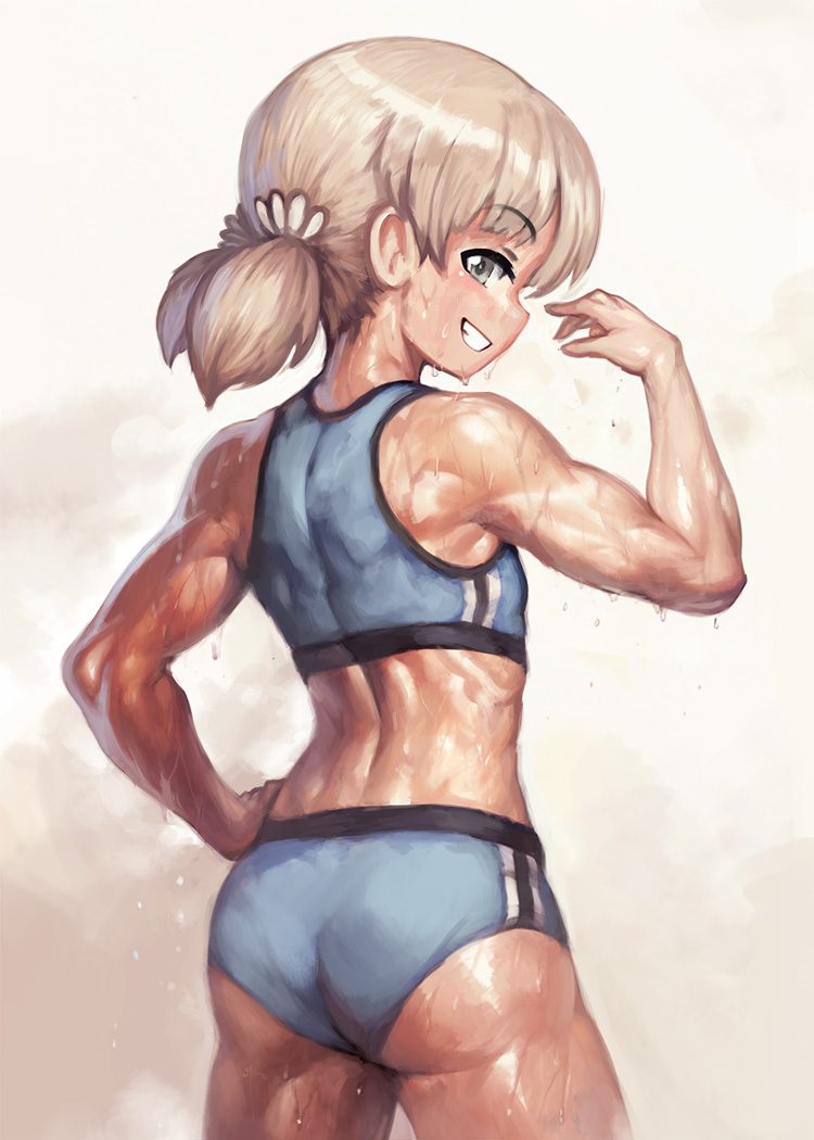 1girlbicepsblonde hairflexingfrom behindfrom sidegrinlooking at viewermuscularmuscular femaleprofilesideways mouthsmilesolosports brasportswearsweatvery sweaty