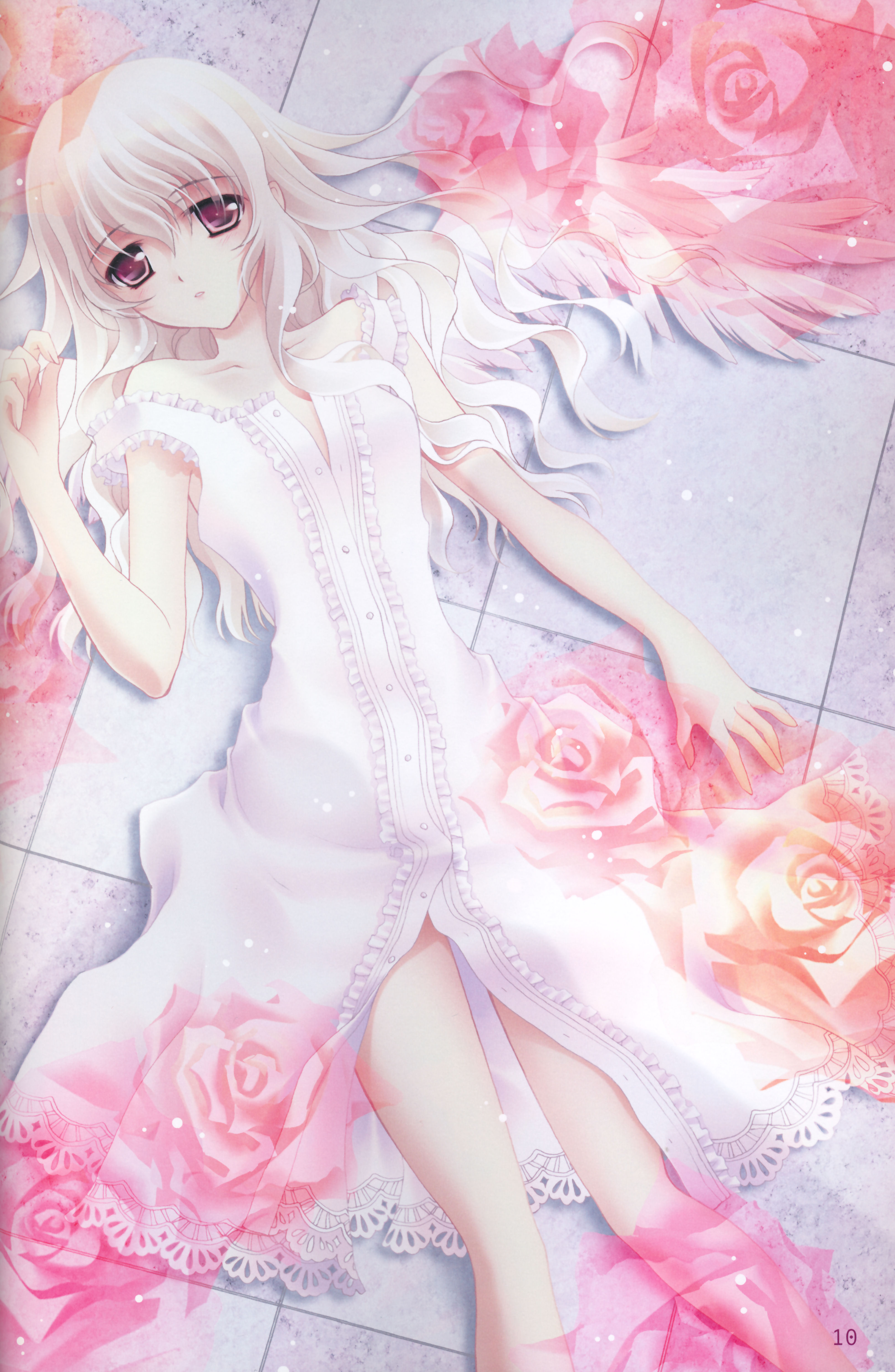 angel wingscenter frillsdressflowerfrillsfrom abovehair between eyessolowavy hairwhite hairwings