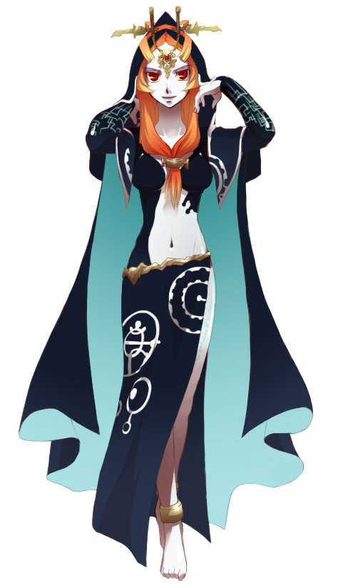 1boy1girlbarefootblue skincolored skinfemale focusfront ponytaillong hairorange hairred eyesrobesmilesolo