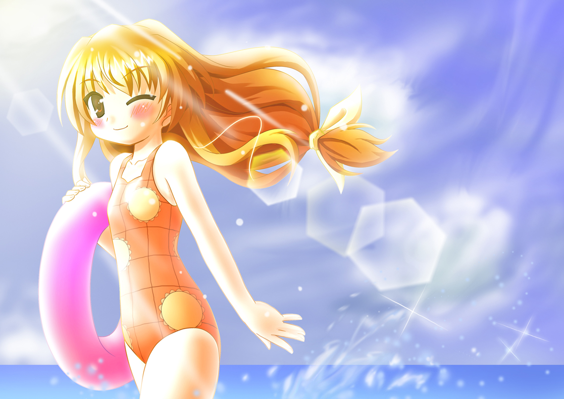 00sbrown eyesinnertubelong hairone eye closedone-piece swimsuitorange hairsolosplashingswim ringswimsuitwaterwink