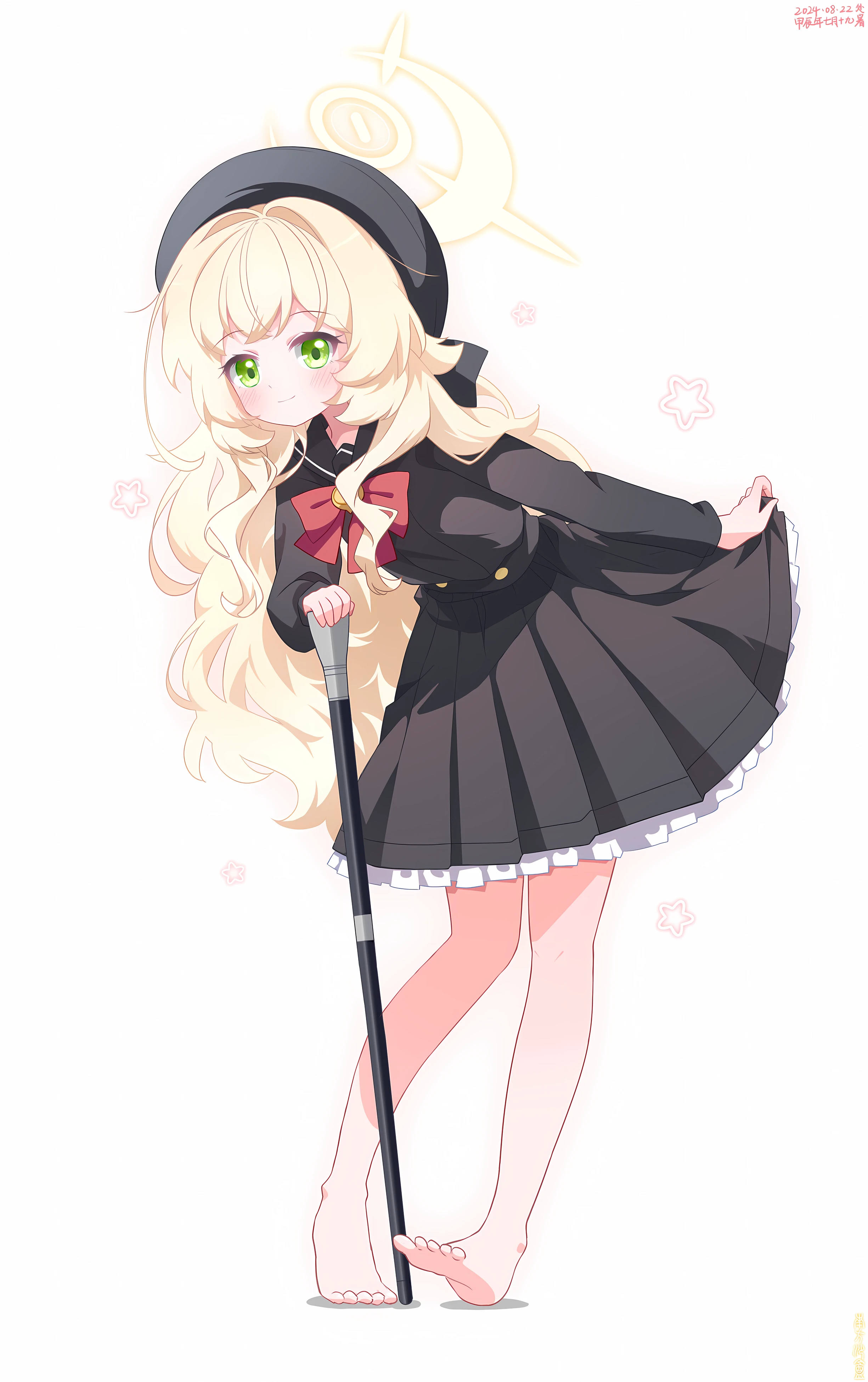 :d1girlbarefootberetblack pantyhoseblack sailor collarblack shirtblack skirtblonde hairblushbowbreastscanefrilled skirtfrillsfull bodygreen eyeshalohatleaning forwardlong hairlong sleeveslooking at viewerno shoesopen mouthpantyhosepleated skirtpuffy sleevesred bowsailor collarschool uniformserafukushirtsimple backgroundskirtskirt holdsmilesolostandingvery long hairwhite background