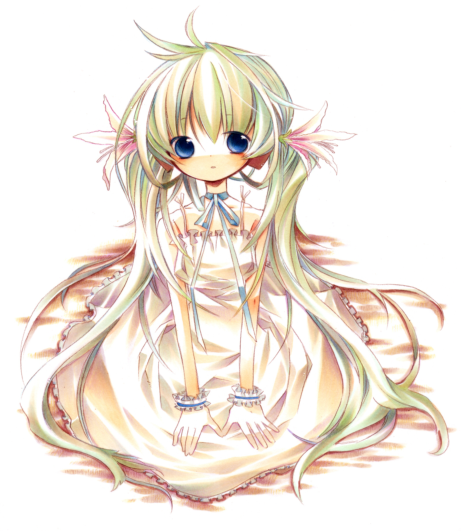 bare shouldersblue eyeschibidressflowergreen hairhair flowerhair ornamentlong hairribbonsittingsolotwintailsvery long hairwristband