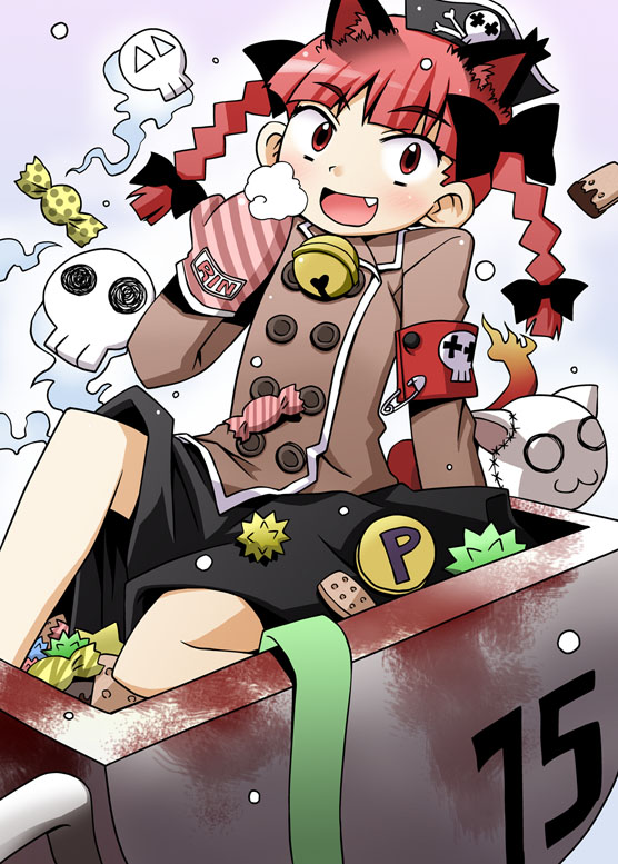 1girlanimal earsarmbandbellbraidcandycat earscat girlfangfemale focusfoodgloveshatmittenspirate hatred hairsafety pinsimple backgroundsittingskullsolotricornewheelbarrow