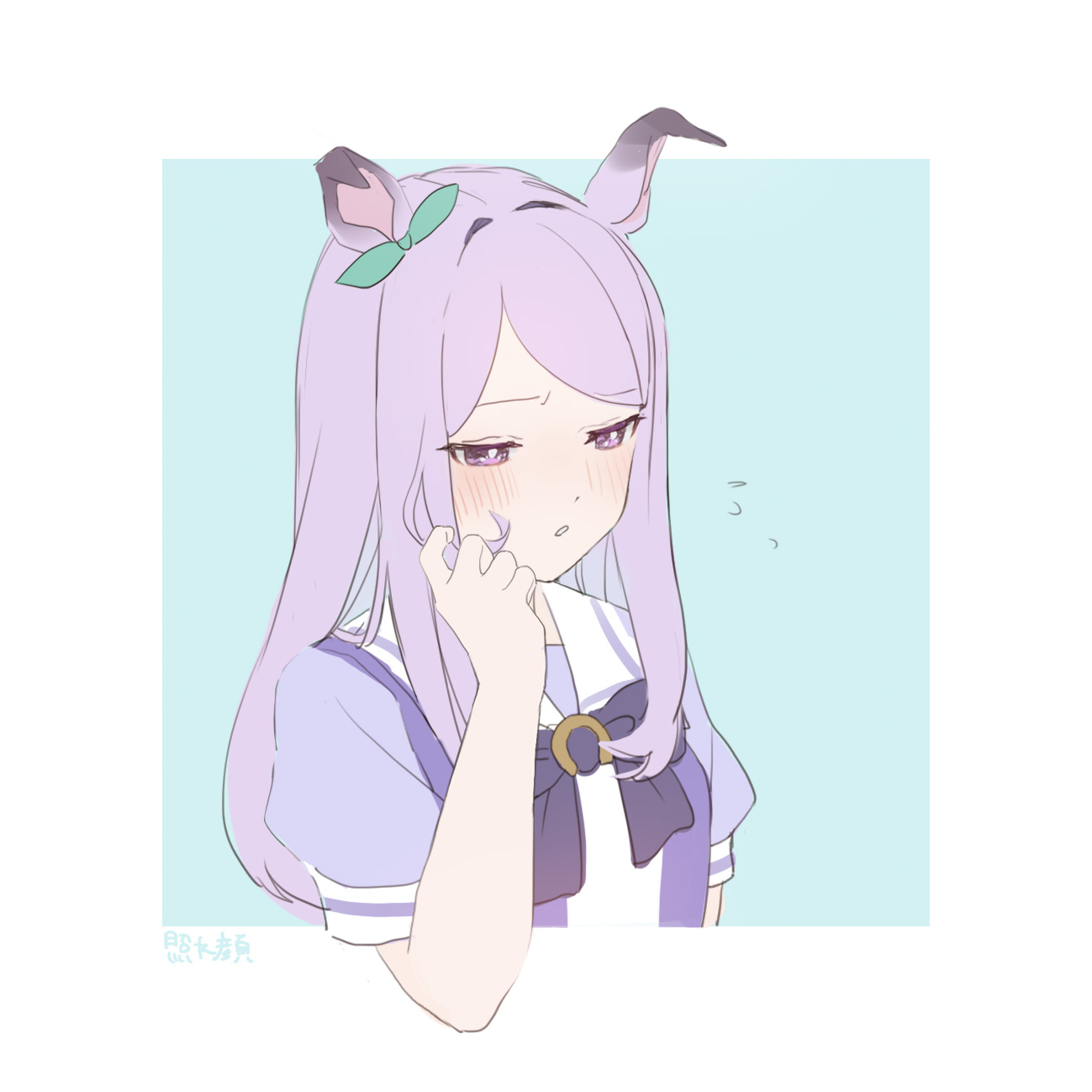 1girl24mugicha56666animal earsaqua bowbowear bowear ribbonhorse earshorse girlhorseshoe ornamentlong hairlong sleevespurple eyespurple hairpurple shirtschool uniformshirtsoloswept bangstailtracen school uniform