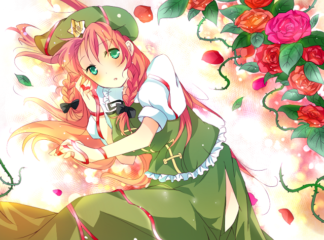 1girlbraidbreastsfemale focusflowergradient backgroundhatplantred hairribbonroseskirtsolotwin braidswhite background