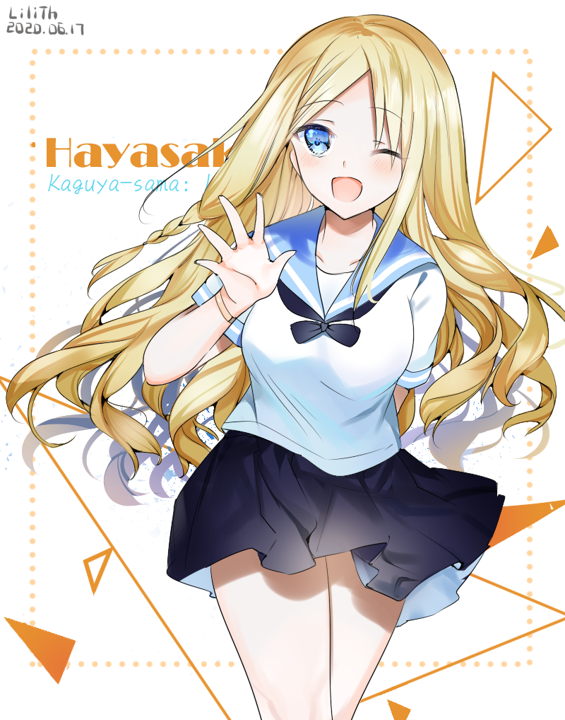 1girlartist nameblack bowblack bowtieblack skirtblonde hairblue eyesblue sailor collarblushbowbowtiecharacter namecopyright namedatedfeet out of framehand uplong hairminiskirtofficial alternate costumeofficial alternate hairstyleone eye closedopen mouthparted bangssailor collarschool uniformserafukushirtshort sleevessimple backgroundskirtsmilesolostandingvery long hairwavy hairwhite backgroundwhite shirt