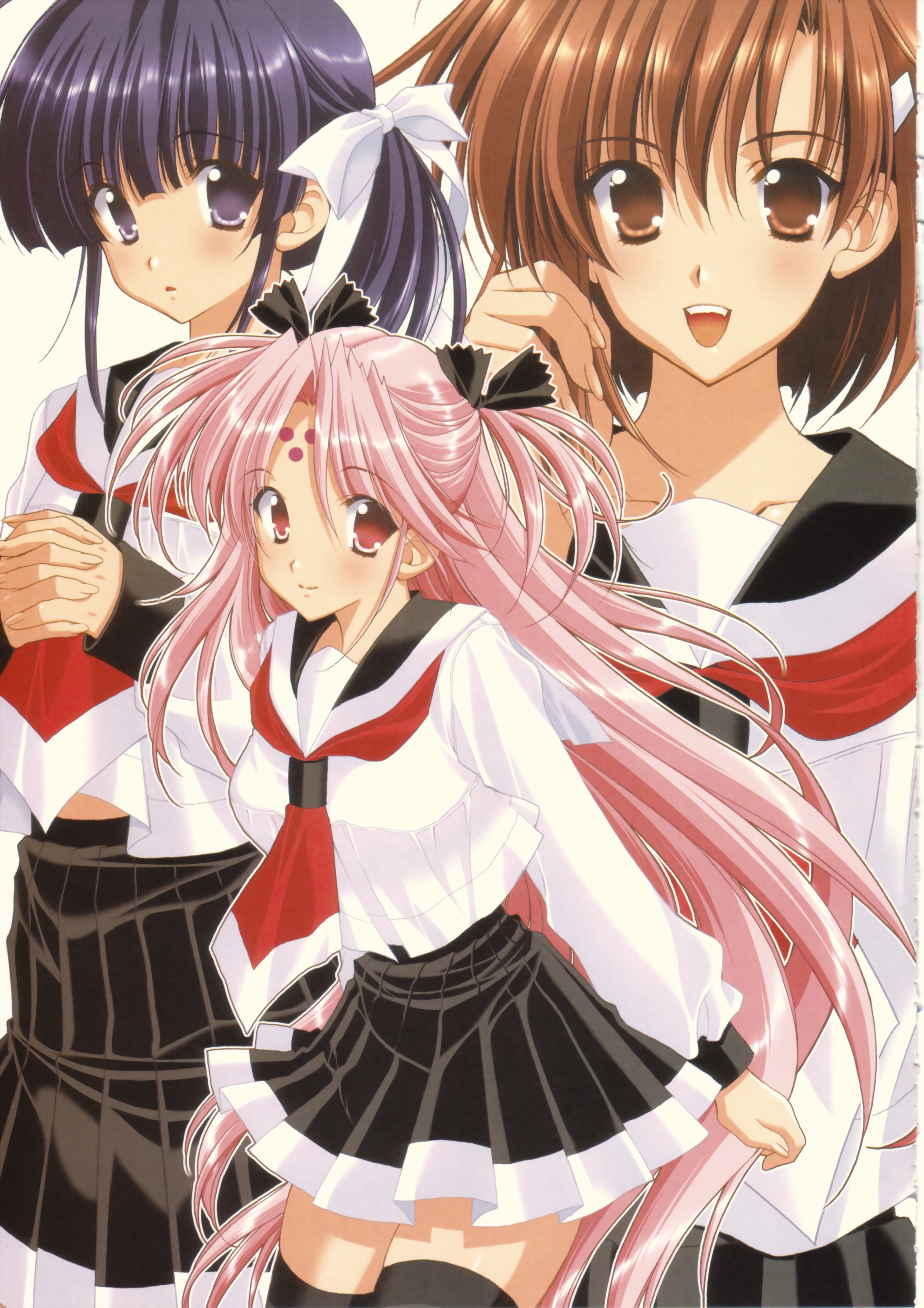 :d00s3girlsblack eyesblack hairbowbrown eyesbrown haircollarbonefacial markhair bowhand in own hairlong hairlooking at viewermultiple girlsnecktieopen mouthpink eyespink hairpleated skirtschool uniformshort hairsimple backgroundskirtsmilethighhighszettai ryouiki