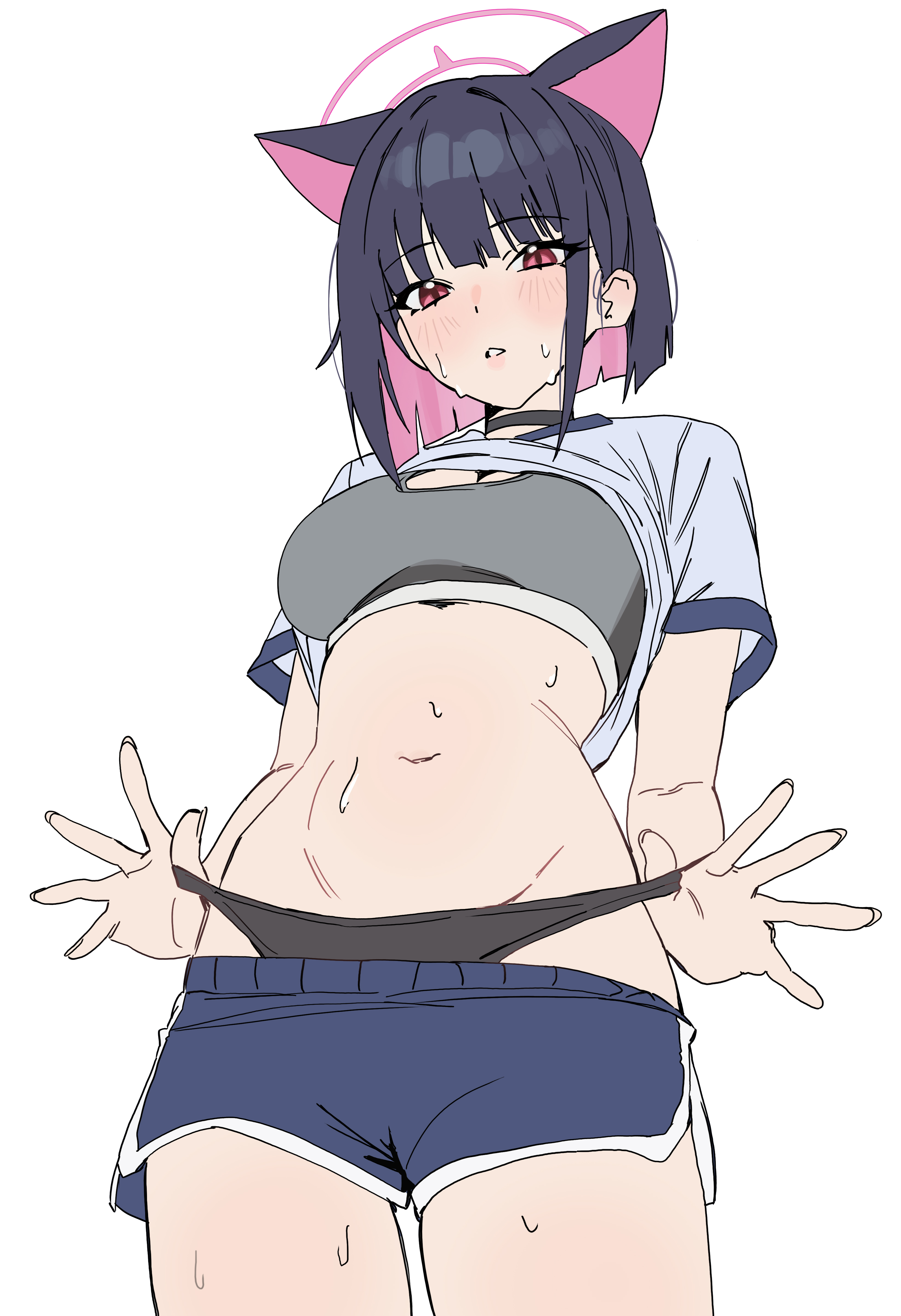 1girlanimal earsblack hairblack pantiesblue shortsblushbracat earscat girlclothes pullcolored inner hairextra earsgrey brahalolooking at viewermulticolored hairnavelpantiespink hairpink halored eyesromaji commentaryshortsshorts pullsimple backgroundsolosweattwo-tone hairunderwearwhite background