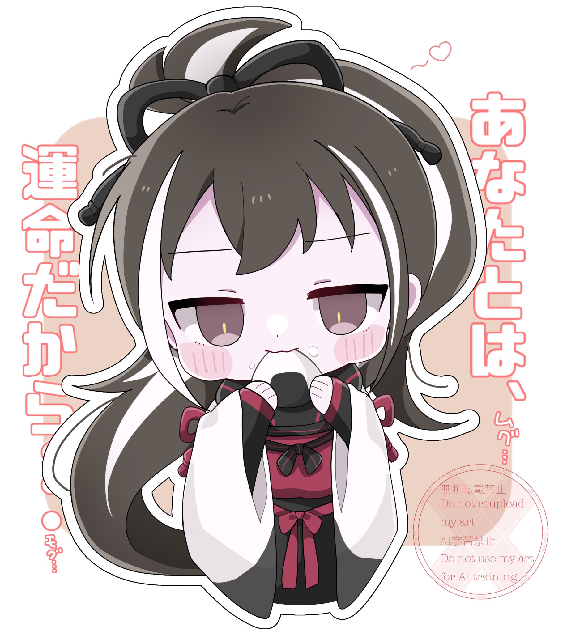 1girlblack eyesblack hairblack scarfblusheatingfoodjapanese clotheskawakami gensai (first ascension) (fate)long haironigiriponytailscarfsolowatermarkwhite hair