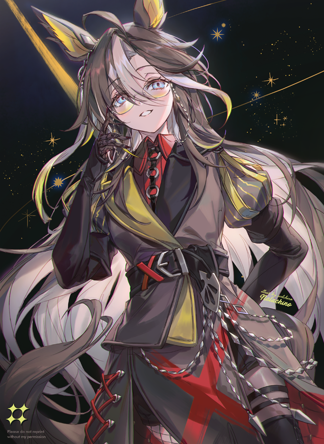 1girladjusting eyewearahogeanimal earsarm behind backartist namebeltblack backgroundblack beltblack coatblack glovesblack hairblue eyescoatcollared shirtcolored inner haircowboy shoteyewear strapfishnet pantyhosefishnetsglassesglovesgrinhair between eyeshand on eyewearhand uphorse earshorse girlhorse taillacelace gloveslong hairlong sleeveslooking at viewermulticolored hairnail polishpantyhosepuffy sleevesred nailsred shirtshirtsmilesolostreaked hairtailtwo-tone hairvery long hairwatermarkwhite hair