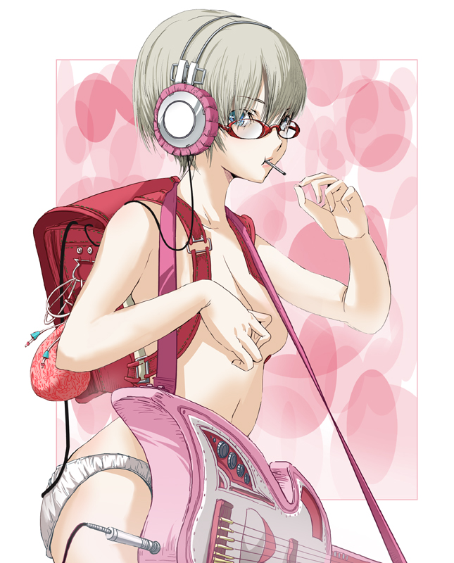 1girlbackpackbagbreastscandyfemale focusfoodglassesgrey hairguitarheadphonesinstrumentlollipopmedium breastspantiesrandoserusmall breastssolounderwear