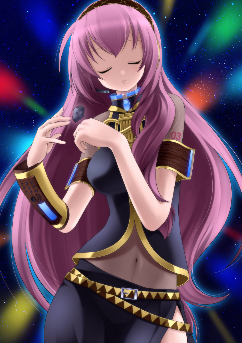 1girlbeltbootsbreastsclosed eyesdetached sleevesfemale focusheadsetknee bootslarge breastslong hairmidriffnavelpink hairsolostar (symbol)