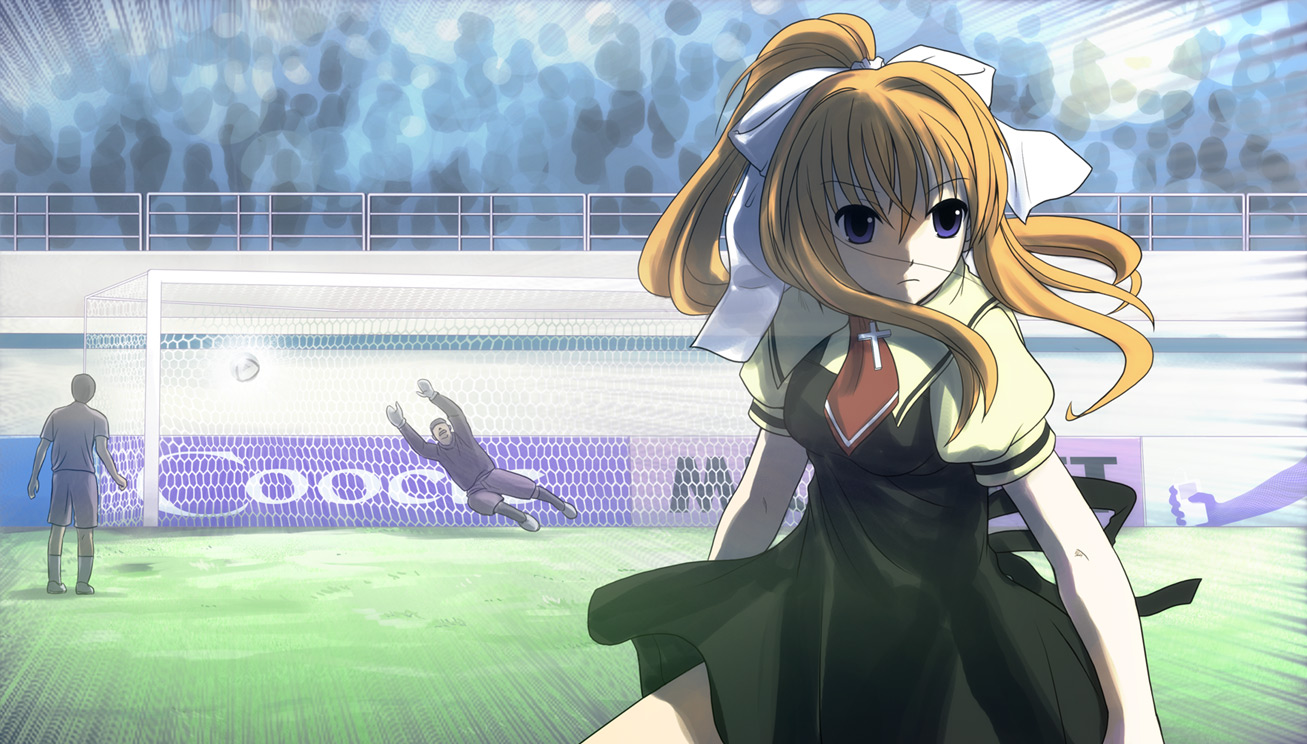 00s1girl2boysballblonde hairblue eyeshair ribbonlong hairmultiple boysplaying sportspunribbonroteiroschool uniformsoccersoccer ballsolo focusstadium