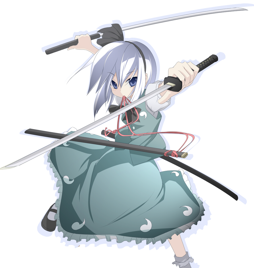 1girlblue eyesdual wieldingfemale focusfighting stancehair ribbonhairbandholdingkatanamouth holdribbonsheathskirtsoloswordtantoweaponwhite background