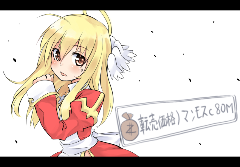 1girlahogeblonde hairblushbrown eyescrosscross necklacedresshalohand upjewelryjuliet sleevesletterboxedlong hairlong sleeveslooking at viewernecklaceopen mouthpuffy sleevesred dresssashsimple backgroundsolotwo-tone dressupper bodywhite backgroundwhite dresswhite sashwinged haloyellow halo