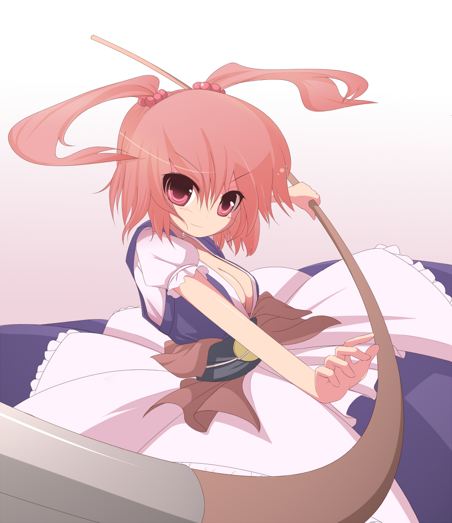 1girlbreastscleavagedressfemale focusfighting stancegradient backgroundmedium breastsred eyesred hairscythesolotwintailstwo side upweaponwhite background