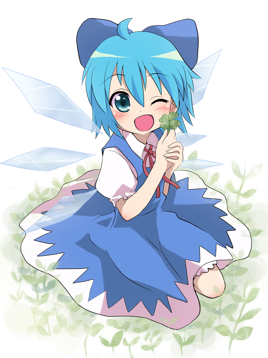 :d1girlblue dressblue eyesblue hairblushcloverdressfemale focusfour-leaf cloverhair ribbonhappymatching hair/eyesone eye closedopen mouthribbonshort hairsittingsmilesolowings