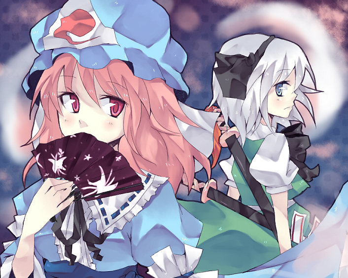 2girlsblue eyesfemale focusfolding fanghosthairbandhand fanhathitodamakatanamultiple girlspink eyespink hairribbonswordweapon