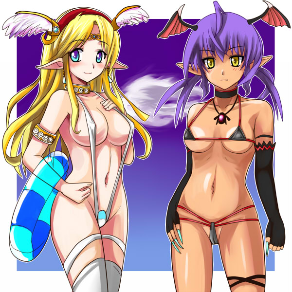 2girlsbikiniblonde hairblue eyesblue hairblushbreastschokercleavagedetached sleeveshead wingsinnertubejewelrylong hairmedium breastsmicro bikinimultiple girlsnecklacepointy earsslingshot swimsuitstring bikiniswim ringswimsuittanthighhighswingsyellow eyes