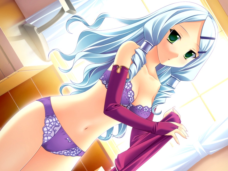 1girlblue hairbrabreastscleavagedutch angleelbow glovesfemale focusglovesgreen eyeshair ornamenthairpinlingerienavelpantiespurple brapurple pantiessolounderwearunderwear onlyundressing