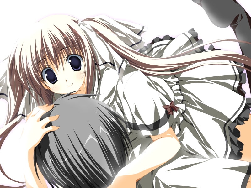 mutsuki (moonknives), boy (air), girl (air), kamio haruko, air (visual novel), key (company), 00s, 1boy, 2girls, apron, black hair, brown hair, child, closed eyes, dinosaur, fang, food, fruit, happy, holding, holding food, holding fruit, holding watermelon, juice box, long hair, multiple girls, red hair, short hair, shorts, smile, stuffed animal, stuffed toy, very long hair, watermelon