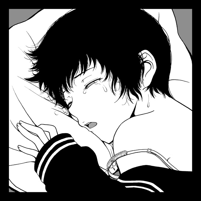 bragreyscalehalf-closed eyeshigh contrastlingeriemonochromeschool uniformshort hairsolosweattearsunderwear