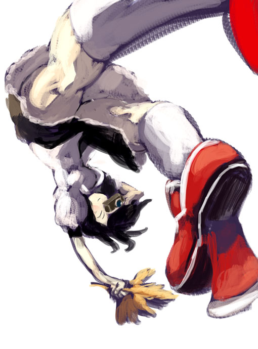 mizuna (water emp-tei), jakuri (ar tonelico), ar tonelico, ar tonelico ii, gust, 00s, 1girl, black hair, covering crotch, covering privates, female focus, flat chest, long hair, navel, nude, red eyes, simple background, solo, very long hair
