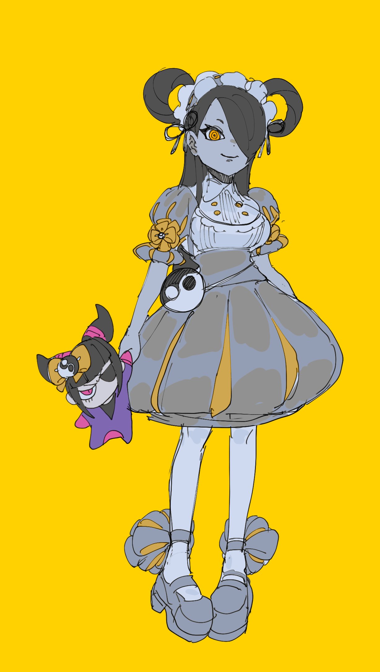 1girlbreastsbubble skirtcharacter dollclosed mouthdollfull bodyhair over one eyehair ringslong hairmaid headdressmedium breastsplatform shoespuffy short sleevespuffy sleevesringed eyesshort sleevessimple backgroundskirtsmilesolounderbustyellow backgroundyellow eyesyin yang