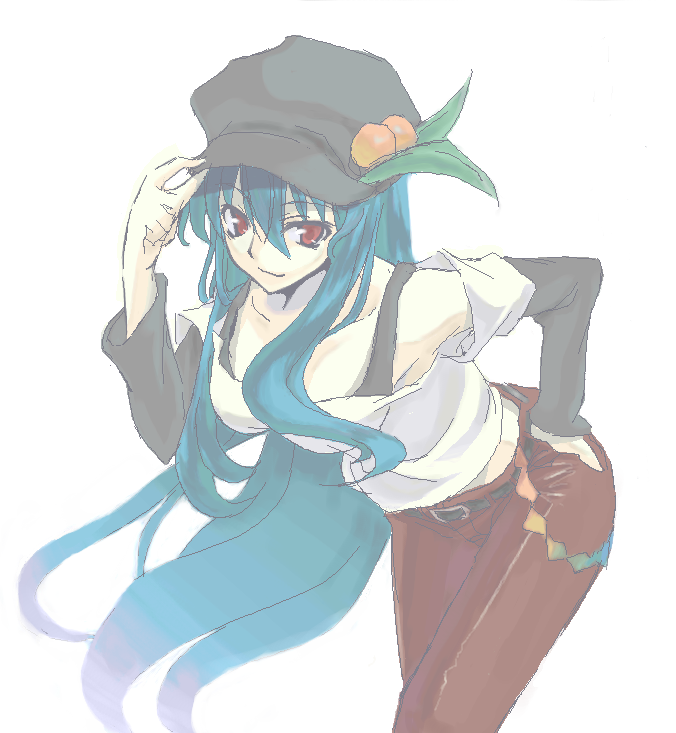 1girlalternate costumebent overblue haircasualcontemporaryfemale focusfoodfruithand on own hiphathip focusleafleaning forwardlong hairnewsboy cappeachred eyessolo