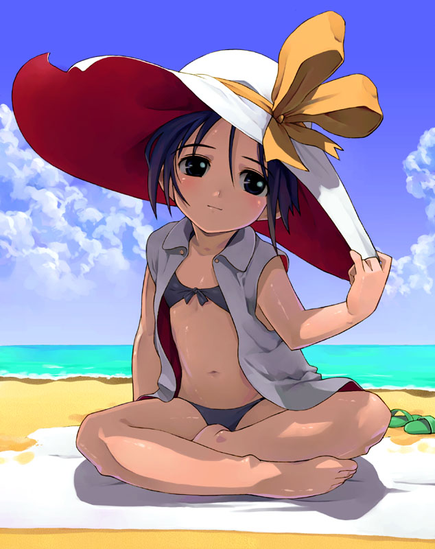 1girlbarefootbeachbikinicrossed legsdayfemale focusflat chesthatindian stylelolioutdoorsshadesittingsolosun hatswimsuit