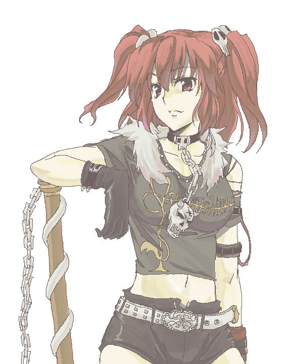 1girlalternate costumecasualchainchokercontemporaryfemale focusgloveshair bobbleshair ornamentred eyesred hairshort shortsshortsskullskull hair ornamentsolo