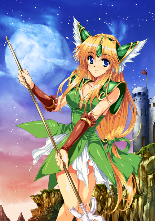1girlblonde hairblue eyesbreastscastlecleavagefemale focushair ribbonlong hairlow-tied long hairmedium breastsmoonpolearmribbonskysolospearvery long hairweapon