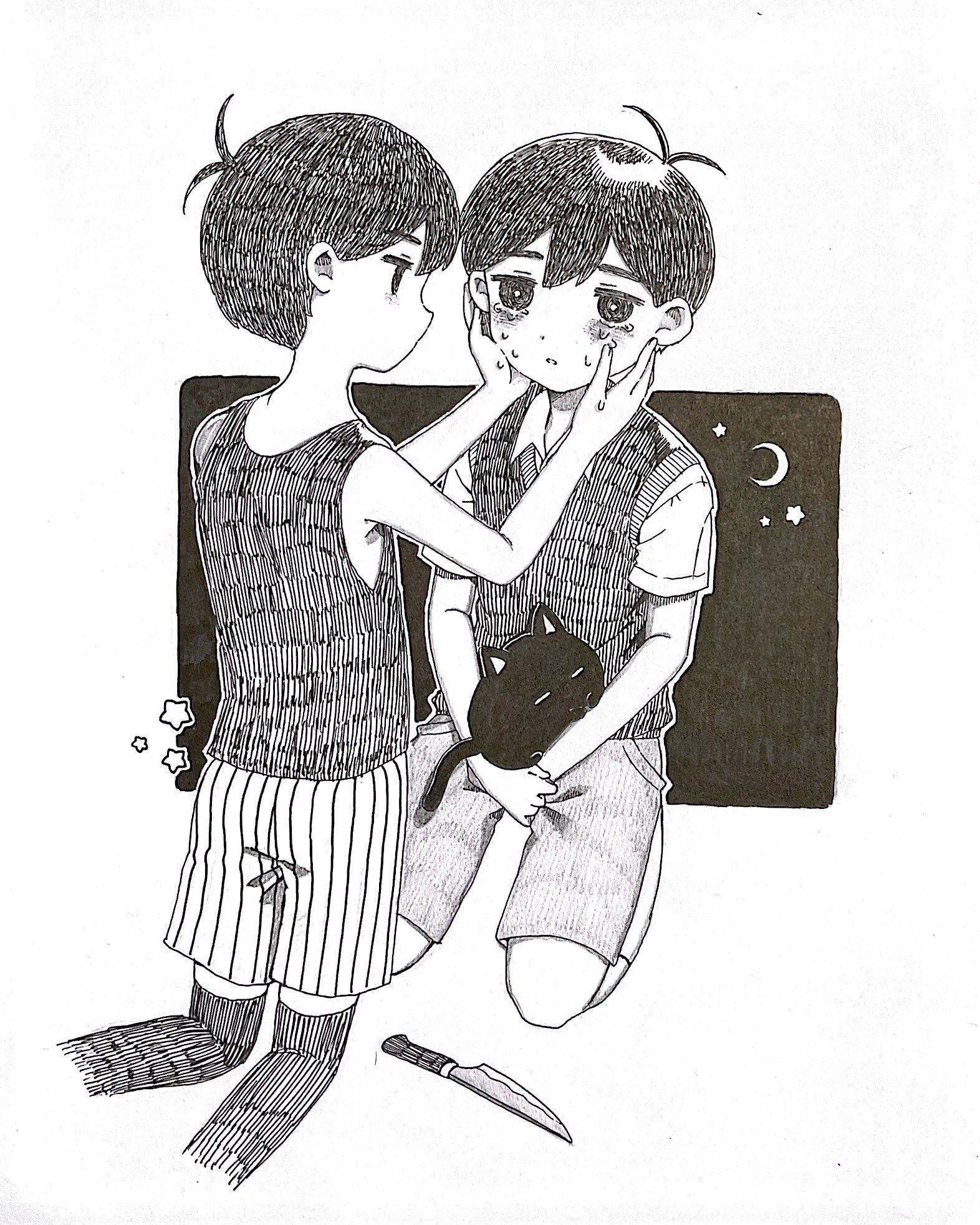 2boysanimalantenna hairblack thighhighsblushbright pupilscatcollared shirtcryingcrying with eyes opendouble-parted bangsdual personagreyscalehair between eyeshands on another's cheekshands on another's faceholdingholding animalkneelingknifelooking at anothermale focusmonochromemultiple boysparted lipsshirtshort hairshort sleevesshortsstriped clothesstriped shortssweater vesttank toptearsthighhighsvertical-striped clothesvertical-striped shorts