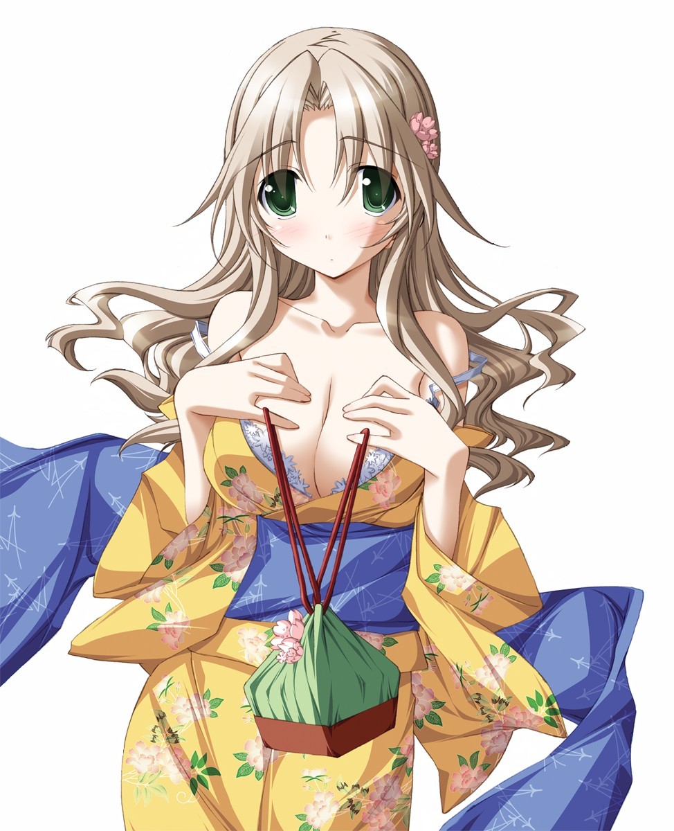 ko~cha, kamisaka haruhi, happiness!, game cg, 00s, 1girl, bra, breast suppress, breasts, cleavage, female focus, large breasts, lingerie, orange shirt, panties, shirt, solo, thighhighs, underwear