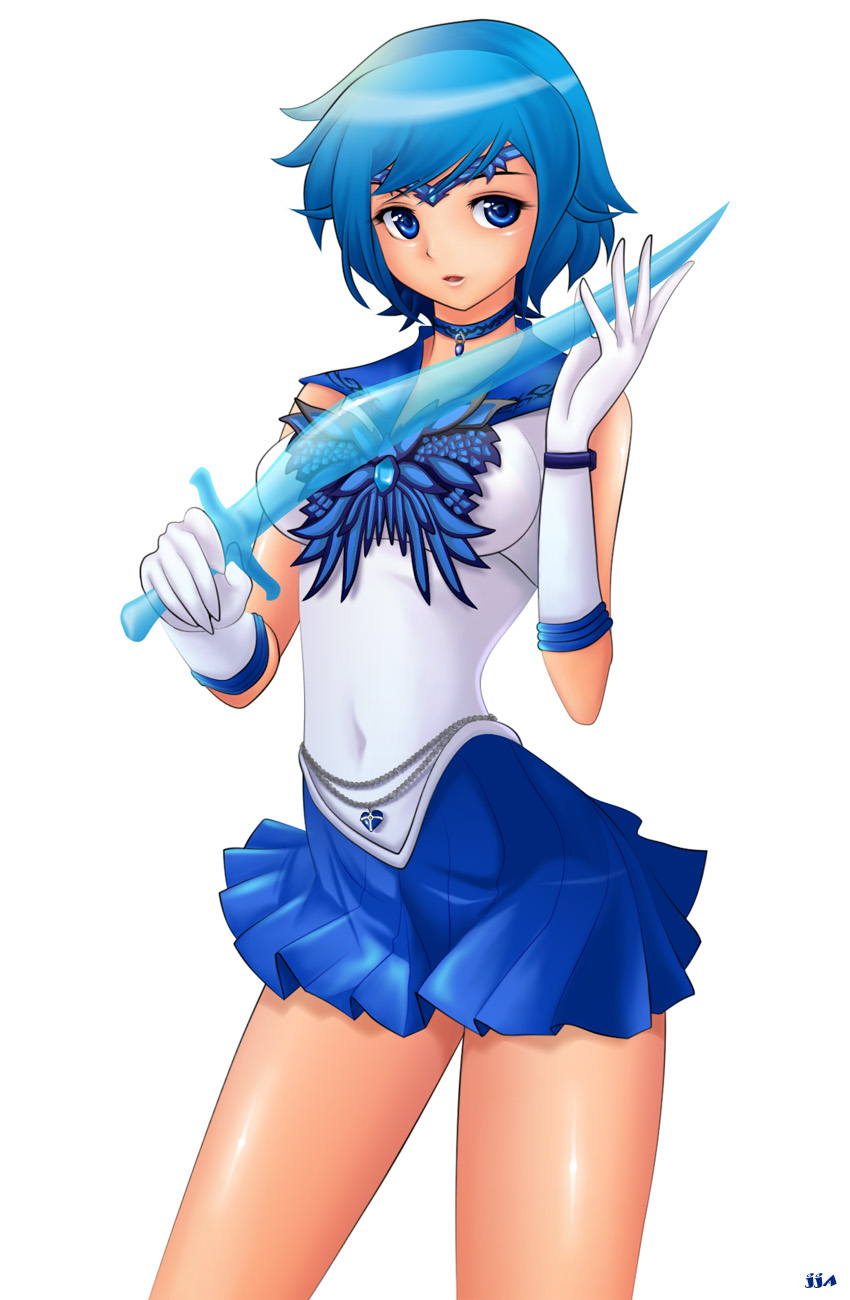 1990s (style)1girlblue eyesblue hairblue lipsbreastschokercowboy shoteyeshadowfemale focuslipsticklooking at viewermakeupmatching hair/eyesminiskirtpleated skirtretro artstylesimple backgroundskirtsoloswordweaponwhite background