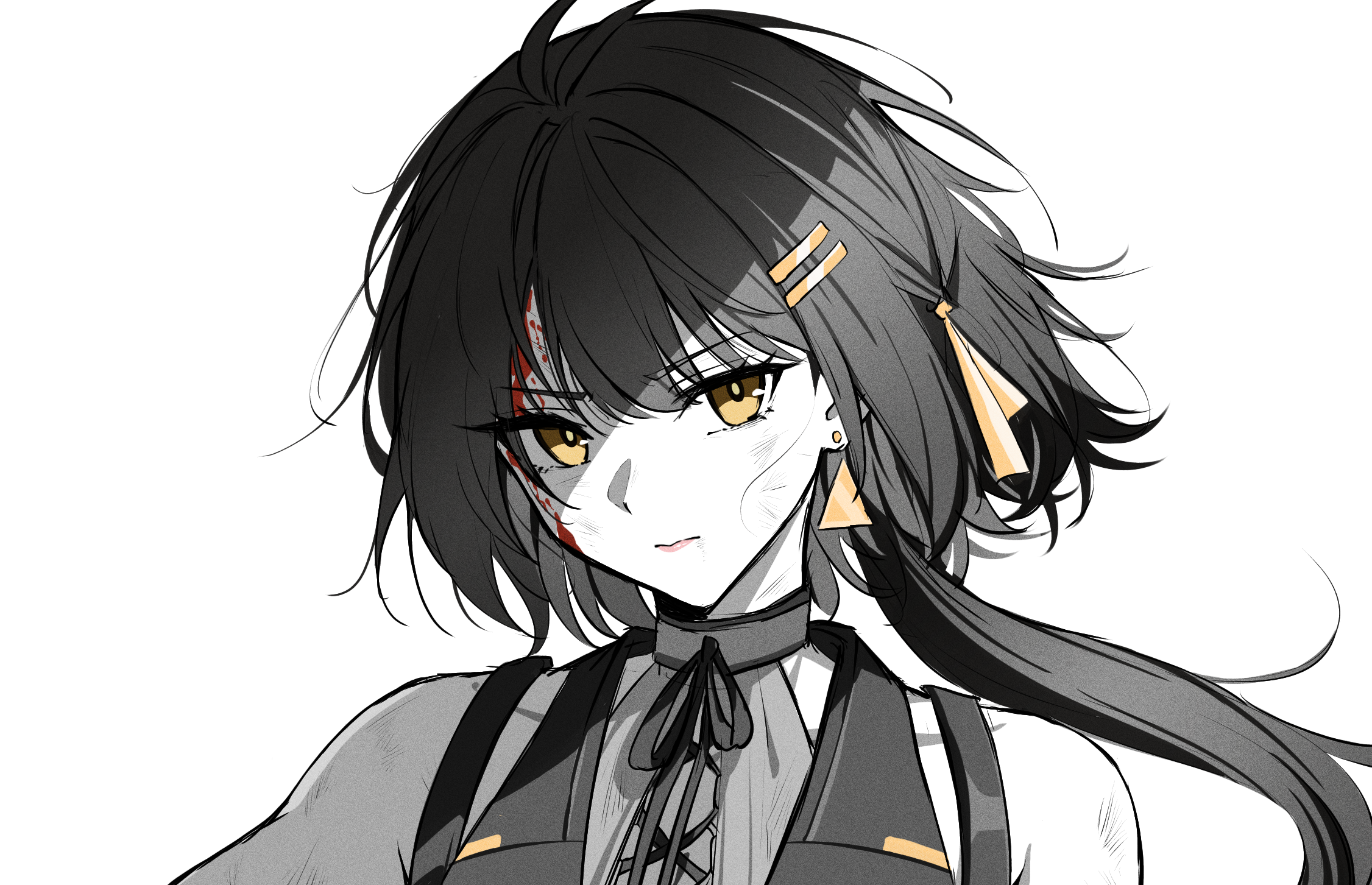 1girlbare shouldersblack hairbloodblood on faceclosed mouthearringshair ornamenthair ribbonhairclipjewelrylong hairlooking at viewerparallel hairclipsribbonsimple backgroundsolotriangle earringswhite backgroundyellow eyesyellow ribbon