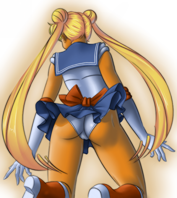 1990s (style)1girlassblonde hairbootsdouble bunelbow glovesfemale focusfrom behindglovesgradient backgroundhair bunkneelinglong hairmagical girlpantiesretro artstyleskirtsolotantwintailsunderwearupskirtwhite panties